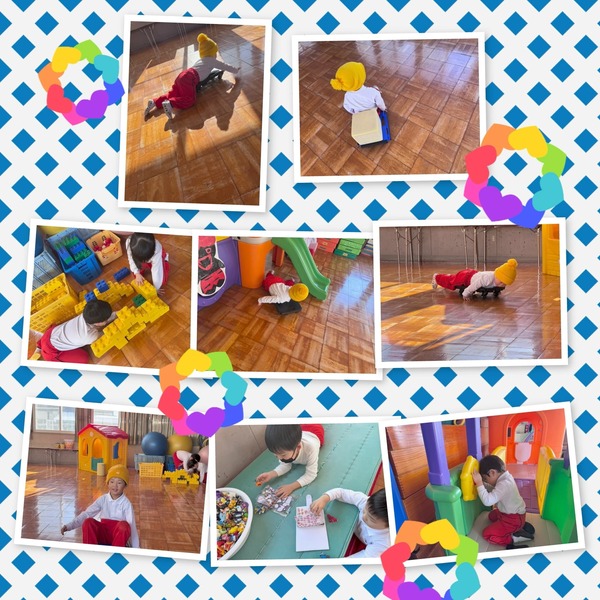 20日金曜日と24日火曜日の自由遊びの風景を可愛くコラージュしてみました。仲良くホールやお部屋で遊ぶ子ども達、それぞれ好きな遊びを見つけて遊んでいます。