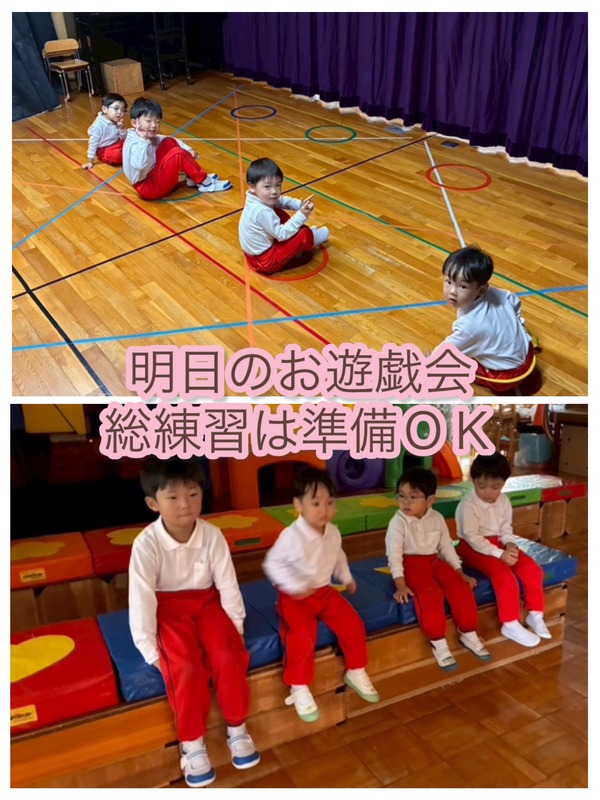 明日はお遊戯会の総練習!今日はみんなで最後のお遊戯のチェックをしたり、本番の様にアナウンスを聞いてから幕を開けて踊ってみたりしました。ホールに積み木でママやパパの座る場所が出来ていて、それに子どもたちが座って座りごごちをチェックしているように見える一面もありました。