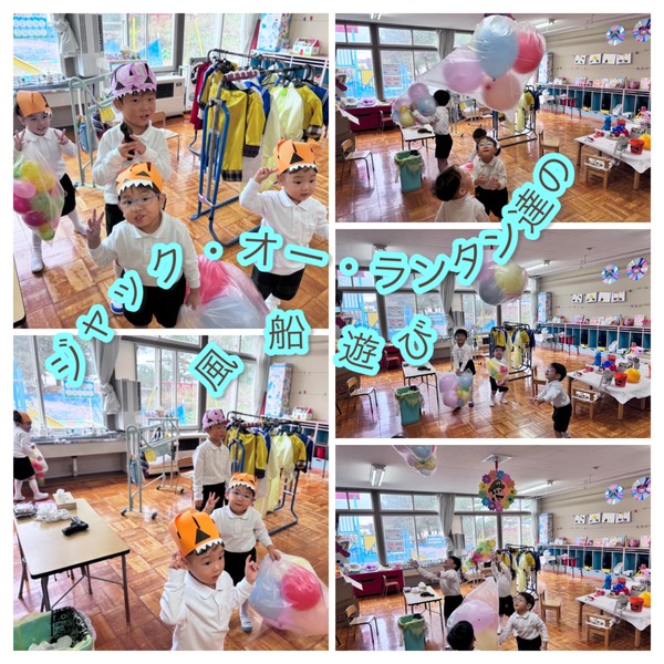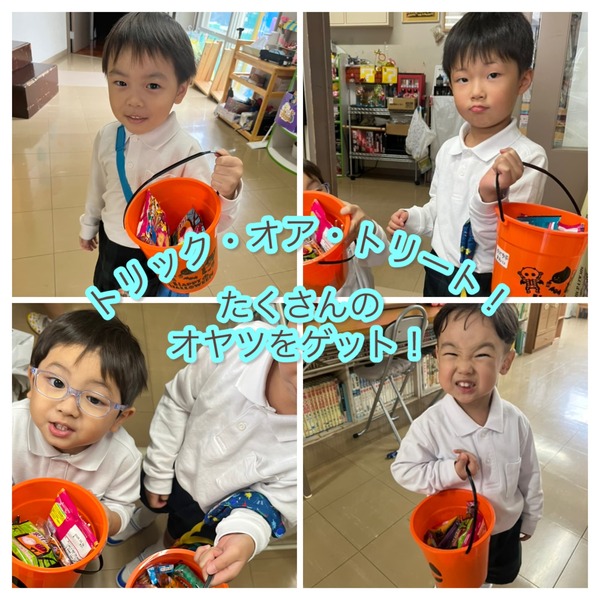 ハロウィンの日に「ジャック・オー・ランタン」が現れたと思ったら、年少さんと年中さんがカボチャの被り物で園内を襲撃していました。色々の所に「がぶっ」と噛むふりをしたり、仲良く走り回ってハロウィンを楽しみました。オレンジのバケツに、沢山のハロウィンのお菓子ももらって満足そうでした。先生と一日1個とお約束してお家に持って帰っていますよ。