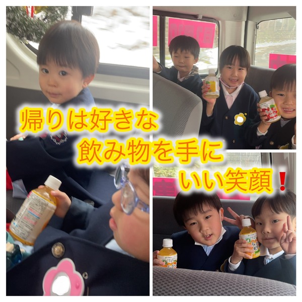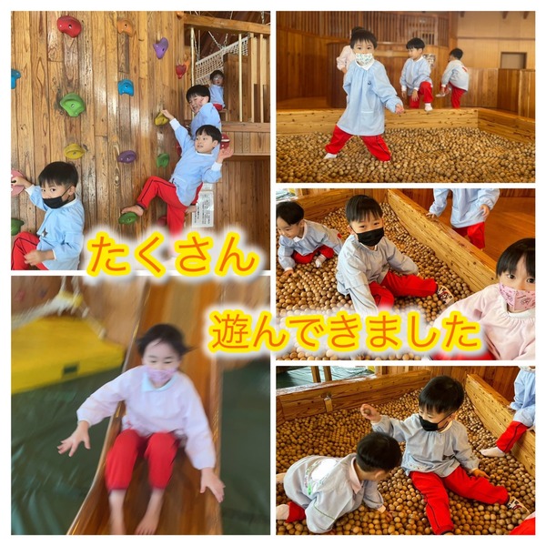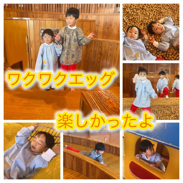 今日もワクワクエッグにお出かけしてきました。たくさんの木のボールプールや大小の滑り台、クライミングなど仲良く楽しそうに遊んでこれました。帰りのバスの中はそれぞれの手に園長先生が買ってくれた自分の好きなジュースをもって笑顔いっぱいでした。