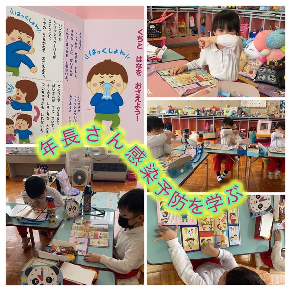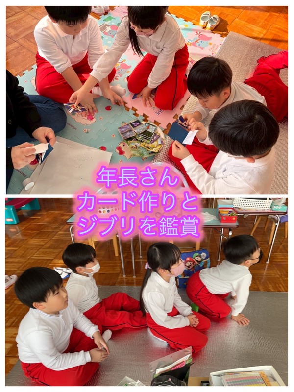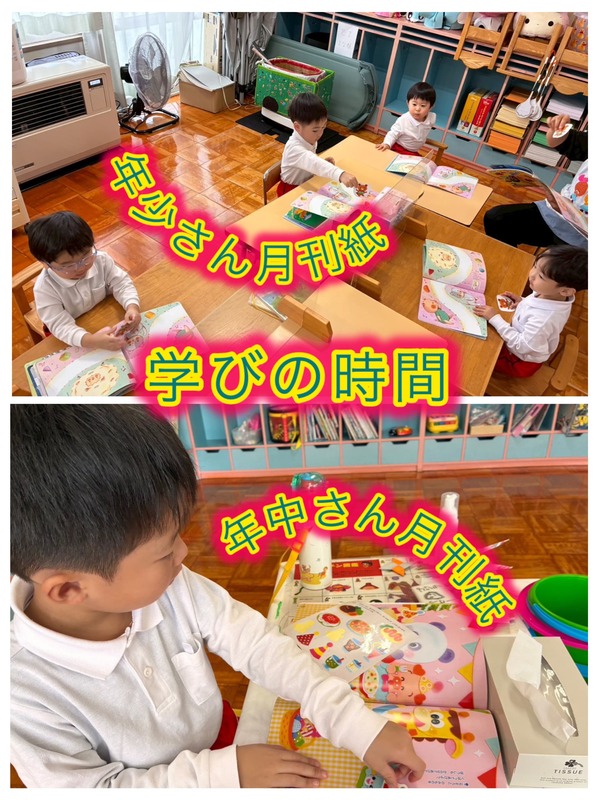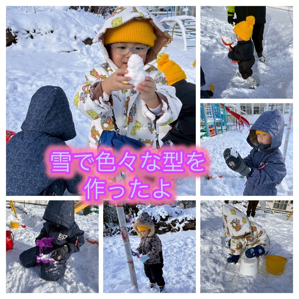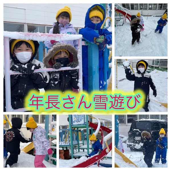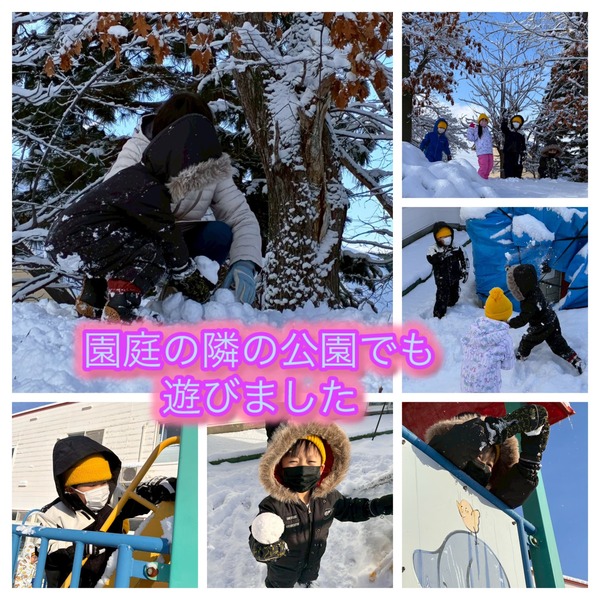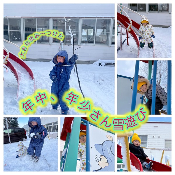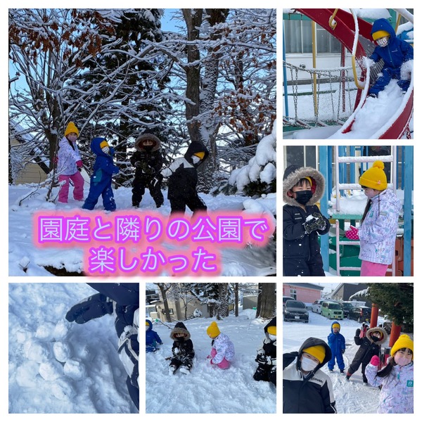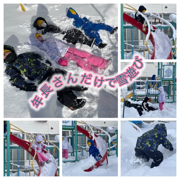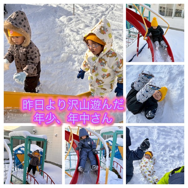 雪の積もった園庭で、年長さんが雪遊びを楽しみました。続いて、年少・年中さんも園庭で雪遊びを楽しみました。年長さんが遊具に積もった雪を上手に遊びながらよけてくれていたので、年少さんが滑り台を滑るのも楽々でした。年少・年中さんが雪遊びをしている間、年長さんと少し早く園に戻った満3歳児さんで園全体を使った”かくれんぼ”をして楽しみました。午後から年長さんは昨日の続きの月刊紙で感染予防についても学習していましたね。外でも中でも楽しく遊んだ子どもたちです。