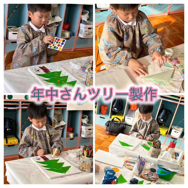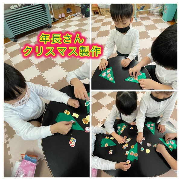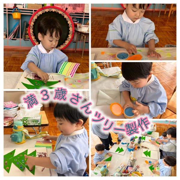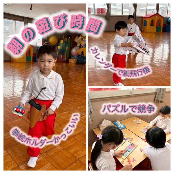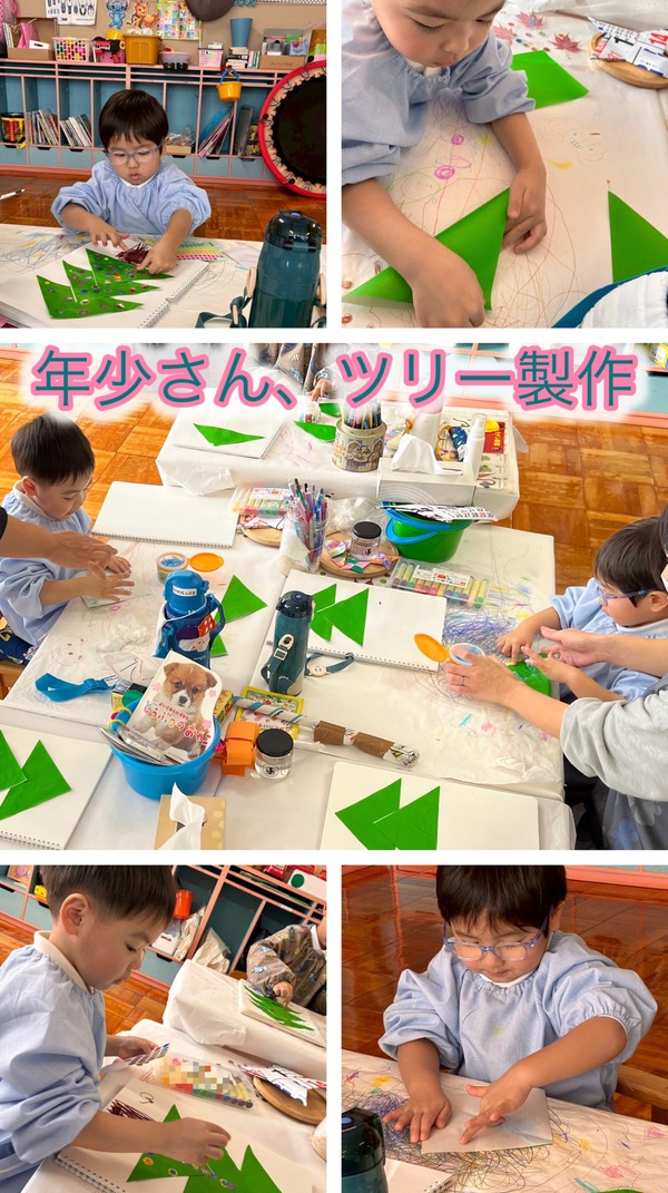 今日は年長さんが寒さに負けず、園庭で元気に雪遊びを楽しみました。年長さんだけの園庭でおもいっきり体を動かして遊んでいましたよ。その後は来週のお店屋さんごっこの準備に一生懸命取り組んでいました。満3歳児・年少・年中さんはお部屋でツリー製作を頑張りました。園で初めて糊をつかう子もいましたが、とても上手に頑張っていました。朝の自由遊びではパズルやカレンダーで作った紙飛行機で遊んだり、おもちゃの銃を手作りのホルダーに入れてかっこよくキメている子がいたりと元気一杯のやまとっ子たちでした。