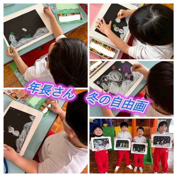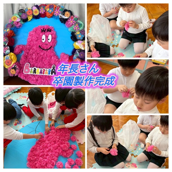 1月下旬から取り組んできた年長さんの卒園記念制作が完成しました。お花紙を一つひとつ開いて作った作品は、とてもかわいらしい仕上がりです。今日は、黒い画用紙に白いクレヨンで描いた冬の自由画も完成し、年中少クラスの先生に見せに行っていました。拍手で迎えられ、一人ひとりにコメントをいただき嬉しそうな年長さんでした。年中さんは月刊誌でお勉強、年少さんは粘土遊びを楽しみ、それぞれ充実した一日を過ごしました。