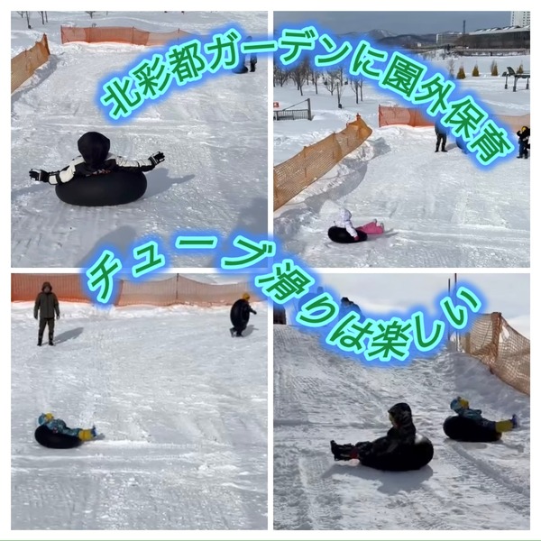 今日の園外保育は、北彩都ガーデンへチューブ滑りに行ってきました。チューブに乗って勢いよく滑ったり、雪の上に寝転がったりと、冬ならではの遊びをたっぷり楽しみました。最後には坂を見つけ、最近年中少さんたちの中でブームになっている「ゴロゴロ転がり」にも挑戦。みんなで転がりながら、元気いっぱいに遊ぶ姿がとても微笑ましかったです。思いきり体を動かし、冬の自然を満喫した一日となりました。