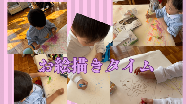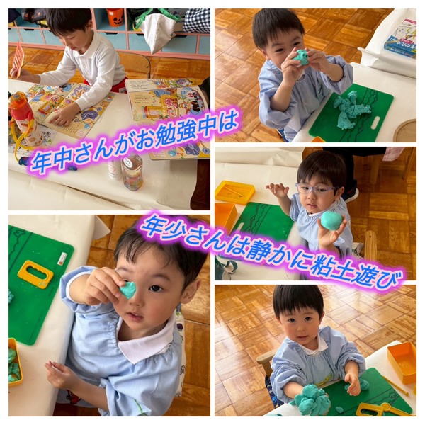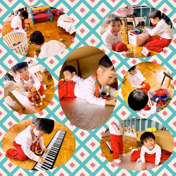 20日金曜日と24日火曜日の自由遊びの風景を可愛くコラージュしてみました。仲良くホールやお部屋で遊ぶ子ども達、それぞれ好きな遊びを見つけて遊んでいます。