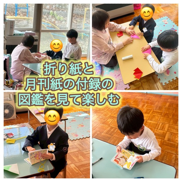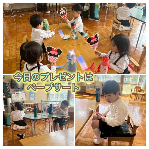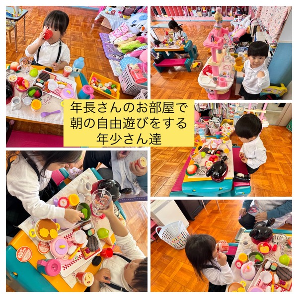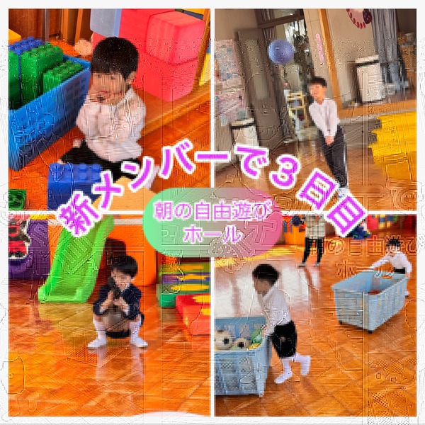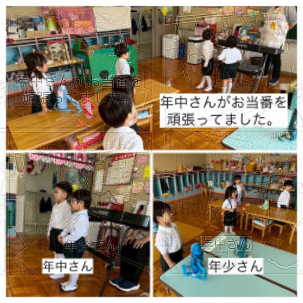 新メンバーでの2日目、年中少さんの手遊び「バスに乗って」は、見ている方も笑顔になるほど楽しそうで、2日目とは思えないほどの一体感を感じました。年長さんも穏やかに折り紙製作をして、自由遊びも元気いっぱいにそれぞれの遊びを楽しんでいましたね。