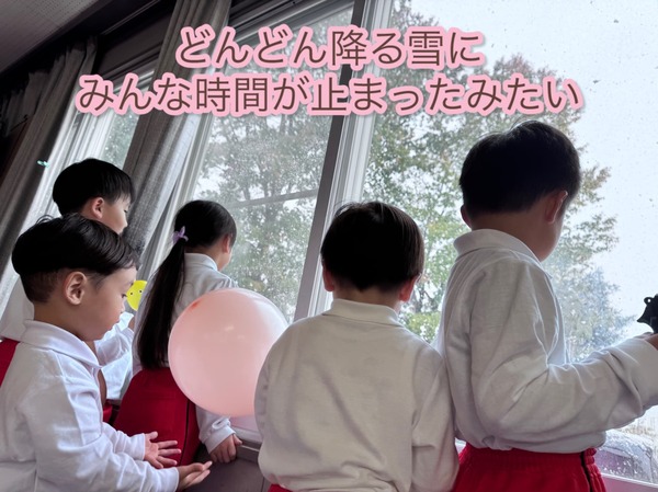 今日は初雪が降り、園庭が少しずつ白くなっていく様子にみんな大興奮。風船遊びを楽しんでいても、雪が強くなると窓辺に集まって、時間が止まったようにじっと園庭を見つめていました。「いつ雪遊びできるのかな?」と目を輝かせる姿が印象的な一日でした。皆で雪の知らせを楽しみに待ちたいと思います。