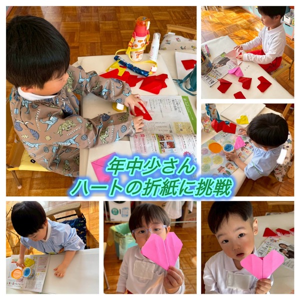 年長さんはホールで卒園式の練習が始まり、お辞儀の場所や進み方を確認しながら頑張って取り組んでいました。年中少さんは指先の練習としてハートの折り紙に挑戦。完成したハートを自由画帳に貼り、かわいらしい作品が出来上がりました。