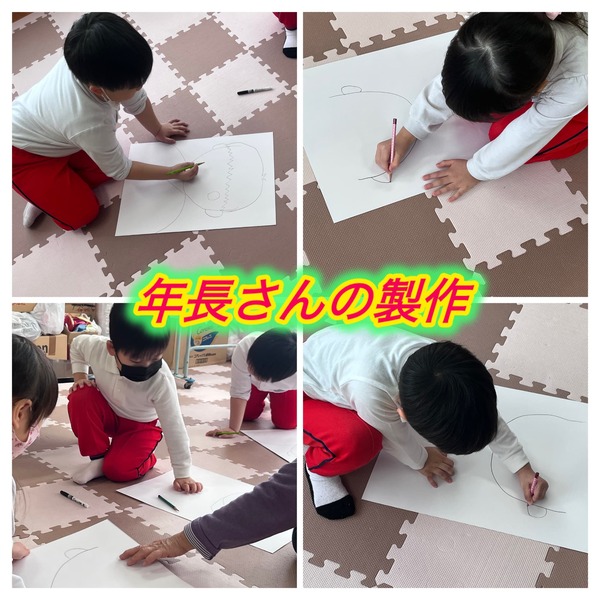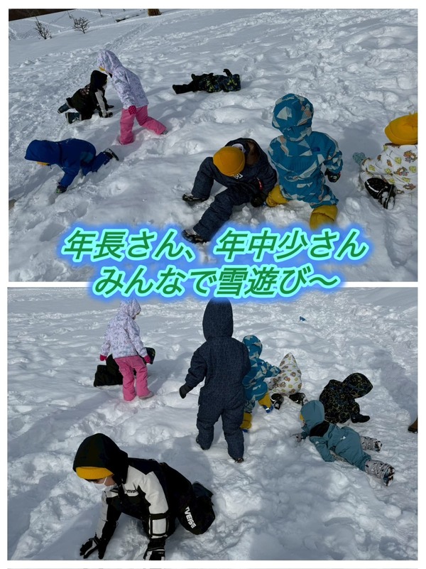 今日は、年中少さんが元気に新雪の中へ雪遊びに出かけました。今回はお尻滑りではなく、横になってゴロゴロと転がりながら坂を下りて楽しみました。年中さんの様子を見て、満三歳児さんも一生懸命真似をし、ゆっくりと転がるのを楽しんでいました。登ったり、駆け下りたり、転がったりと、新雪の中の坂を上手に使って遊びを満喫することができました。年長さんは、大きな画用紙に考えながら人の様な物を描いていました。どんな作品か誰を描いたかはおたのしみだそうですよ。
