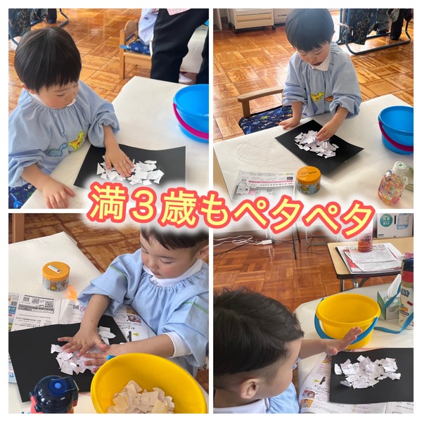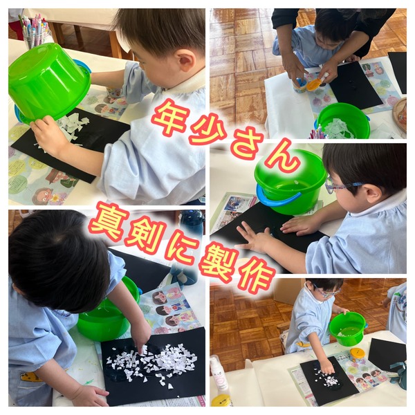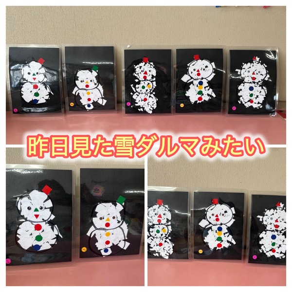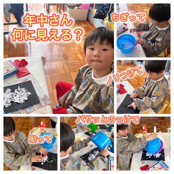 今日の幼稚園では、それぞれの学年で制作活動を楽しみました。年長さんは、先日描いた人の絵に絵の具で丁寧に色付けをしていました。完成までもう少しで楽しみです。年中少さんは、白い紙をちぎってちぎり絵に挑戦。黒い画用紙に糊をつけ、バサッとちぎった紙を落としてペタペタと貼っていきました。何ができるのかな?と思っていると、出来上がったのはかわいい雪だるま。子どもたちは夢中になって制作を楽しんでいました。