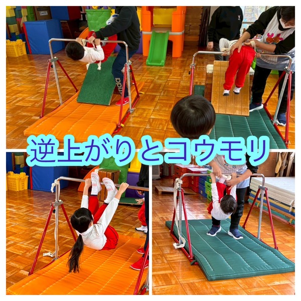 今日は体育遊びがありました。新しく入った満3歳児さんにとっては2回目の体育遊びでしたが、1回目と違いお友達と一緒に鉄棒やマット運動、ケンパシートに挑戦する姿が頼もしかったです。他の子達も鉄棒を怖がらずに果敢に挑戦し、先生の補助がありましたが逆上がりを経験することができました。子ども達のあきらめないで頑張る姿に嬉しさを感じる日となりました。