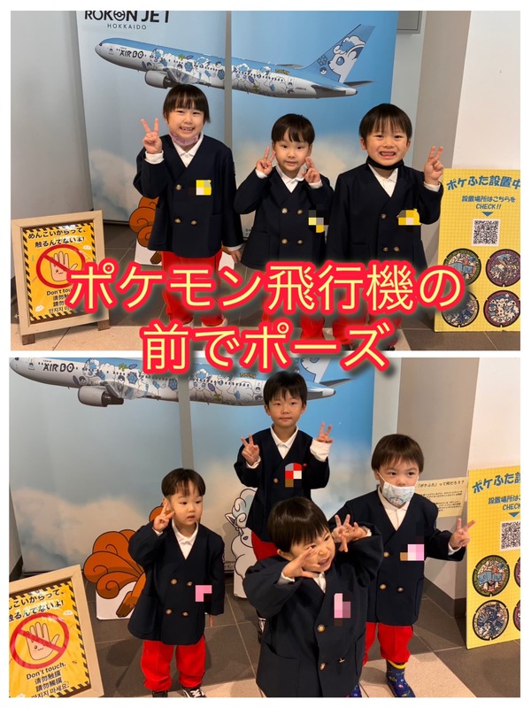今日は園外保育で旭川空港にお出かけしました。朝は濃霧の中飛行機が出発準備をしている様子を見ることができました。飛行機に乗りたがる満3歳児さんもいて、飛行機が動き出すと子ども達は元気一杯「バイバーイ!」と手を振りとても可愛い姿が見られました。飛行場内の遊び場でも切り株のクッションでそれぞれ楽しそうに創作遊びをしていました。飛行機にワクワクして遊び場でウキウキの園外保育となりました。