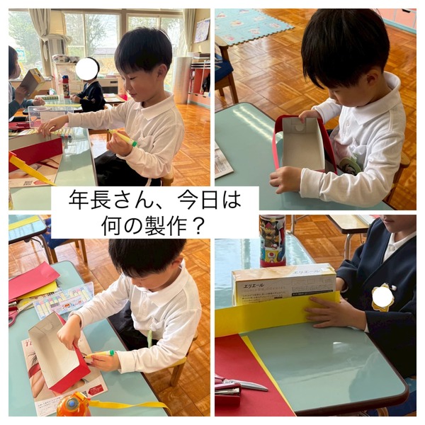 午前中は、卒園・修了式に向けて今日もみんなで一生懸命練習に励みました。練習の後は、それぞれお部屋で楽しい時間。年長さんはマーカーとティッシュを使ってデザイン画を作りました。年中少さんは「やぎのお面」をかぶりながら、お絵かきを楽しんだり先日作ったバスを救急車に変身させてもらって遊だりしました。練習も遊びも元気いっぱいなやまとっ子たちです。