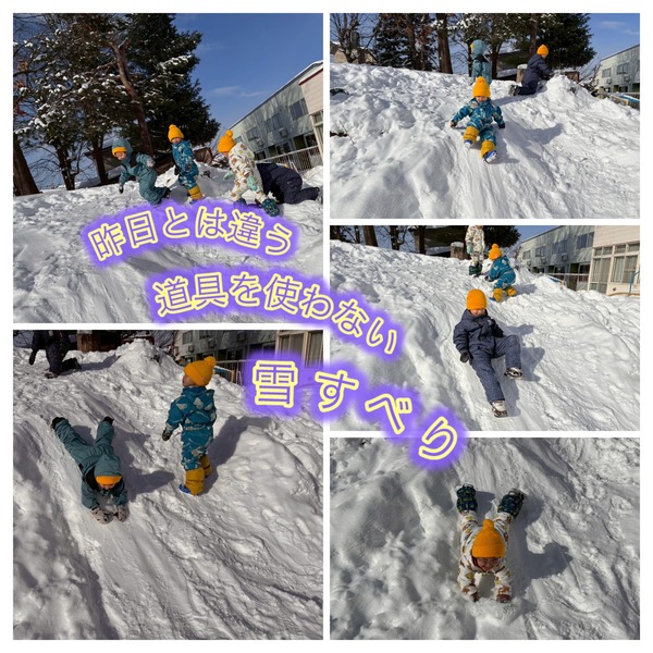 今日は園庭で雪遊びを楽しみました。お尻滑りに挑戦し、満3歳児さんも少しずつ滑れるようになりました。