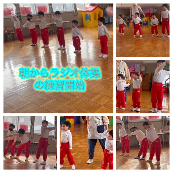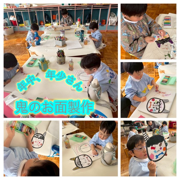 今日は年中少さんと年長さんが一緒に、朝からラジオ体操の練習をしました。音楽に合わせて体を動かし、元気いっぱいのスタートです。その後は各お部屋に分かれ、鬼のお面作りや、折り紙を使った手作りコマの制作を行いました。子どもたちはそれぞれの活動に夢中になり、工夫しながら楽しんで取り組む姿が見られました。
