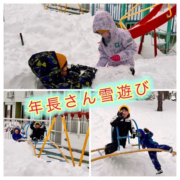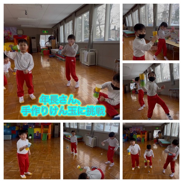 園庭の坂でお尻滑りを楽しみました。前よりも上手に滑れるようになり、年少さんも笑顔で挑戦しています。雪遊びの合間に雪に寝転がって仲良く休憩している子もいました。また、年長さんは手作りのけん玉にも挑戦。できても、できなくても、何度も諦めずに取り組む姿がとても素敵でした。