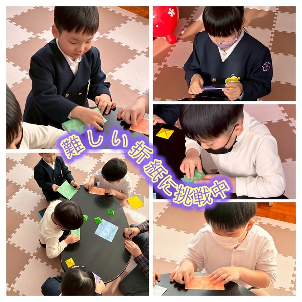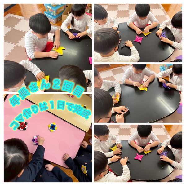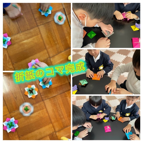 体育遊びでは、ドッジボールを経験しました。最初はボールを投げる練習から始め、ドッジボールも「避ける動き」を知るところからゆっくり挑戦しました。担任の先生や講師も一緒になって、年少・年中・年長さんが学年を越えて参加し、笑顔いっぱいで体を動かす時間となりました。楽しみながら、ボールに親しむ姿がたくさん見られました。年長さんは数日かかると言っていた難しい折り紙のコマを完成させて回していました。とても良く回るコマでしたよ。