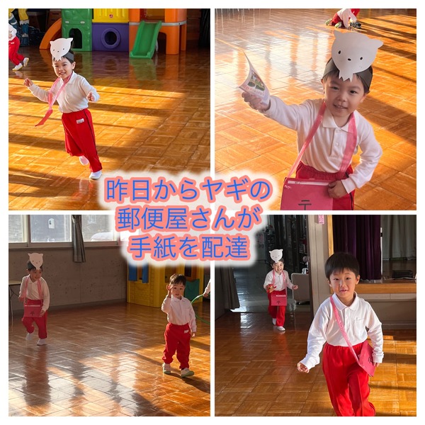 年長さん・年中さんはコースを工夫しながら作り、迫力ある雪遊びを楽しんでいました。園庭に出られなかったお友だちは室内で粘土遊びをし、年長さんは月刊誌で世界のお祭りについても学びました。年中・年少さんは白ヤギさんの郵便屋になって園内で「手紙でーす」と言って小さな紙を配達していましたよ。