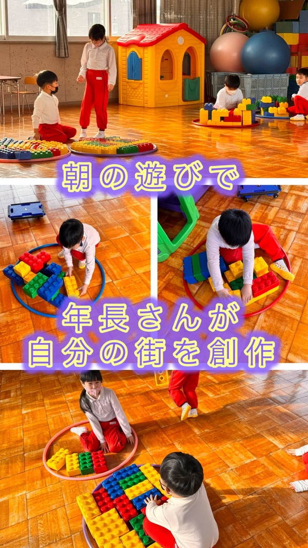 今日は年少さん・年中さんが園庭の雪遊びを楽しみました。道具は使わず、昨日年長さんが作ってくれたコースの中でも小さな所で、お腹滑りやお尻滑りをしながら、笑顔いっぱいの時間を過ごしました。お部屋では、年長さんが少し難しい折り紙に挑戦。何枚も折った折り紙を組み合わせて作る折り紙で数日かかるそうです。集中して取り組む姿に成長を感じました。朝の遊び時間にはフラフープの中にブロックで自分の街を作る年長さんの姿も見られましたよ。