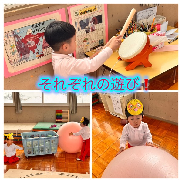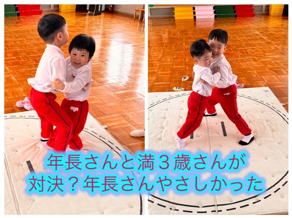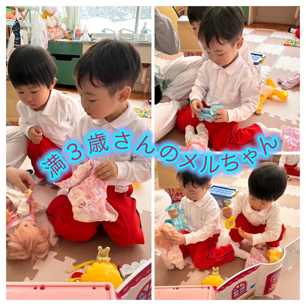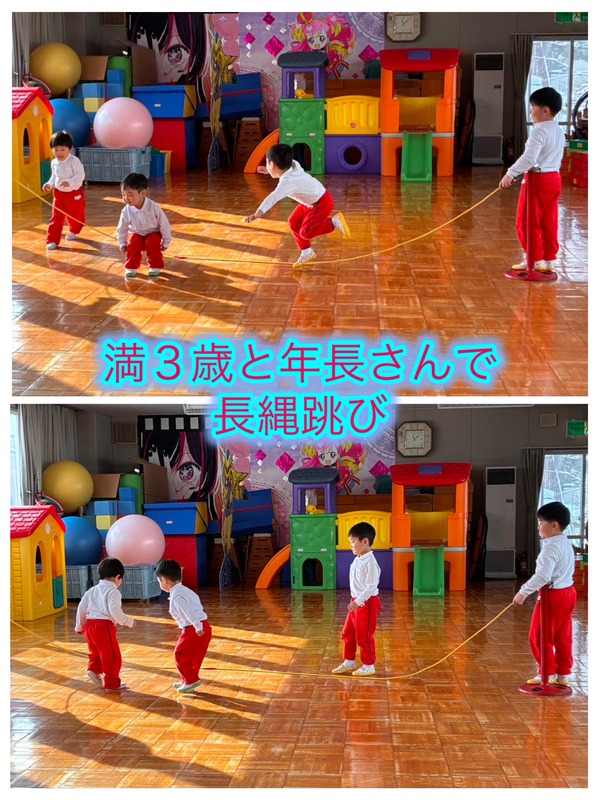 厳しい寒さや、暴風雪があった3日間でしたが、預かり保育ではお部屋やホールで元気に楽しく遊べました。メルちゃんで遊ぶ満3歳児さん同士、年齢関係なく長縄跳びや押し相撲、写真には撮れなかった台車遊びやポケモン人形でのごっこ遊びなど色々でした。子ども達の楽しそうな笑い声は寒さを忘れる特攻薬ですね。