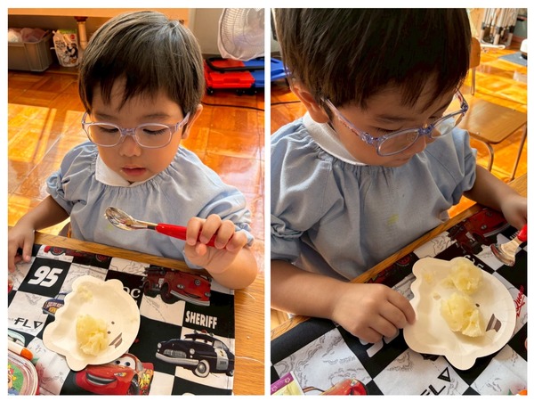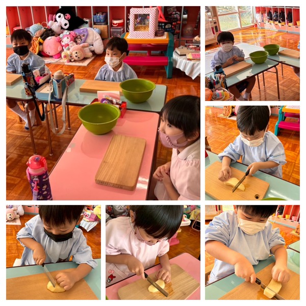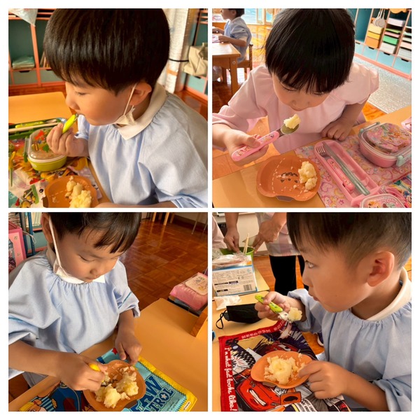 今日は幼稚園で第6回お遊び会があり、4名のお友達が遊びに来てくれました。少しずつ幼稚園や先生にも慣れ、笑顔で楽しく遊ぶ姿や先生と会話する姿が見られました。お参加いただきありがとうございました。次回もぜひお待ちしています。お遊び会の後は、年長さんが朝顔の種取りと色水作りを楽しみました。午後からは年長さんと年中さんが芋の収穫に挑戦!土の中から大きなお芋が顔を出すと「わぁ!」「すごい!」と大歓声。みんなで収穫の喜びを分かち合いました。今日から新しく入った年少さんと年中さんが帰り際、段ボールで作った救急車と消防車で仲良く追いかけっこしている姿は微笑ましかったです。