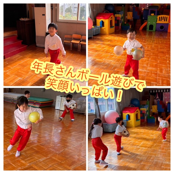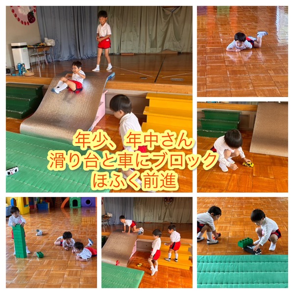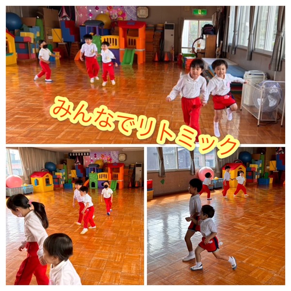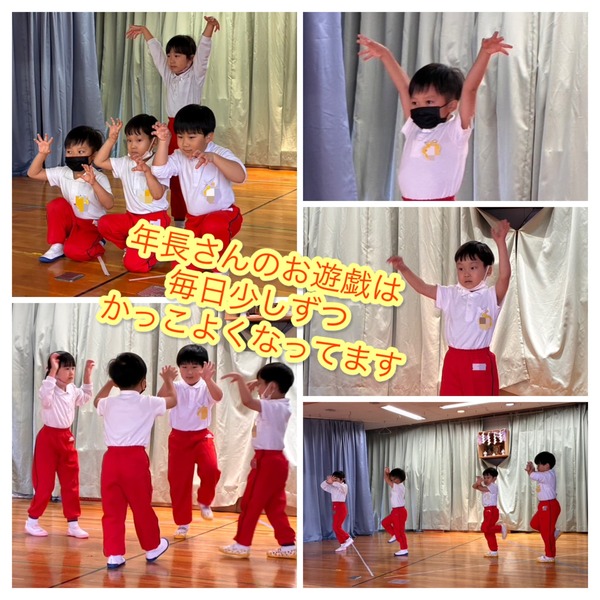 今日は、年少さん・年中さんが元気いっぱいにお遊戯の練習をしていました。年長さんは、振り付けをかっこよく変化させながら、一生懸命取り組む姿が見られました。そのほかにみんなで仲良くリトミックに挑戦もしていました。遊びの時間には、年少さんが見事なほふく前進を披露し、先生たちから「すごいね!」とたくさん褒められていたのが印象的でした。