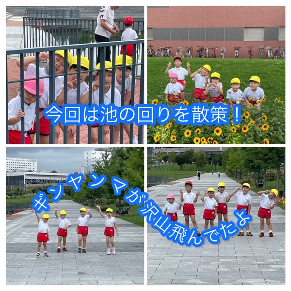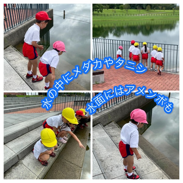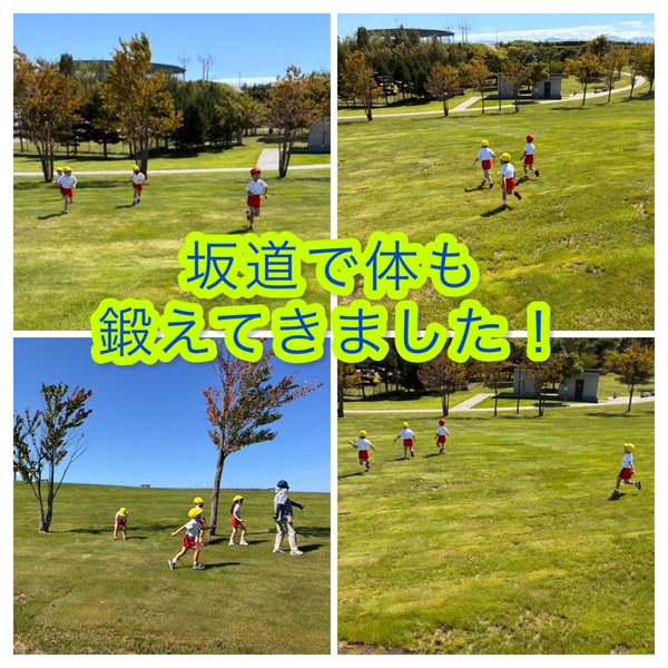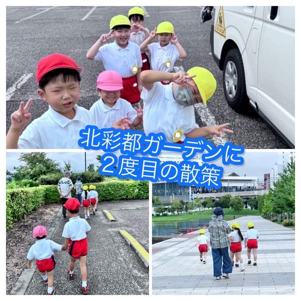 朝、幼稚園の玄関で普段見かけるものとは違うクモを発見し、ケースに入れてみんなで観察しました。虫が大好きな子は目を輝かせて大興奮!その後の園外保育では北彩都ガーデンを散策し、たくさん歩いてきました。旭川駅でひと休みした際には、年中さんが駅に置いてあるピアノで習っている曲を披露してくれる場面もありました。園に帰ってからは、ご飯の後に、年少・年中さんが朝のクモの観察画を描き、年長さんは敬老の日に向けてお手紙を書きました。自然や地域の環境、人とのつながりを感じながら、1日を楽しく過ごしました。