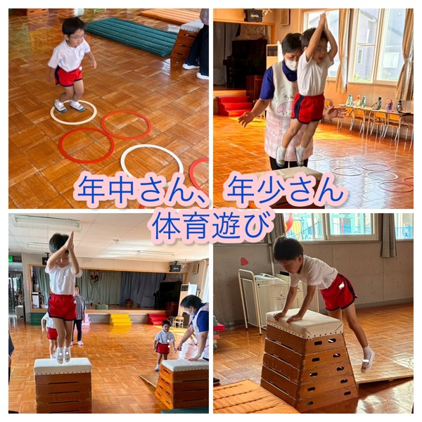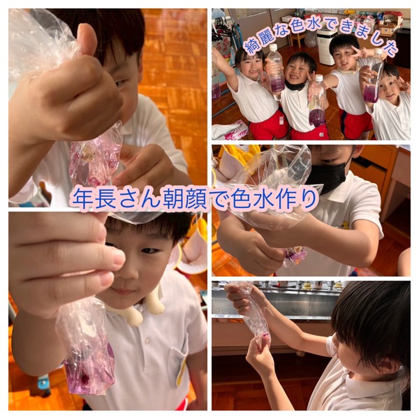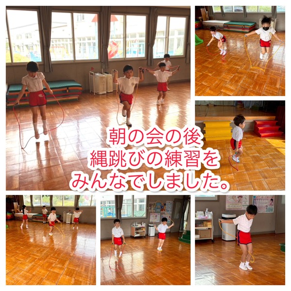 今日の跳び箱では、年中さんと年長さんが5段の跳び箱に挑戦して跳べるようになりました。年少さんはあと一歩のところまで頑張る姿が見られました。準備運動での縄跳びでは年長さんは連続20回と後ろ飛びに挑戦し、連続20回の所をそれ以上飛んでいる子がいたり、後ろ飛びを連続して跳ぶ子がいました。年中、年少さんも丁寧に1回づつ跳ぶ練習を頑張りました。体育遊びでの後は年長さんは朝顔で色水作りを年少・年中さんは月刊紙で学びを深めていましたよ。