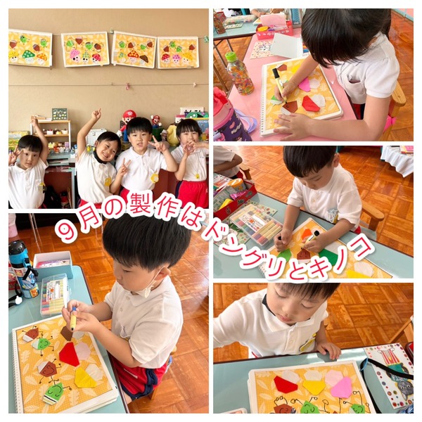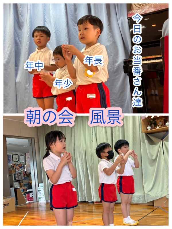 今日は朝の自由遊びではいつも通り異年齢のお友達と一緒にお部屋で仲良くごっこ遊びを楽しみました。その後はホールに集まり、サッカーをしたり、新体操のリボンを使って体を動かしたりして元気いっぱいに過ごしました。朝の会では初めて年少さんが皆の前で大きな声で自分の名前をいう事ができました。その姿に先生やお友達から拍手が送られ「できたね!」とたくさん褒めてもらいました。保育活動では、年長さんは折り紙でキノコを作ったり文字の練習に取り組んだりしました。年少さん・年中さんは粘土遊びを楽しんだり、ホールでのびのびと体を動かして遊びました。異年齢でも同年齢でも、みんなが楽しい一日を過ごすことができました。